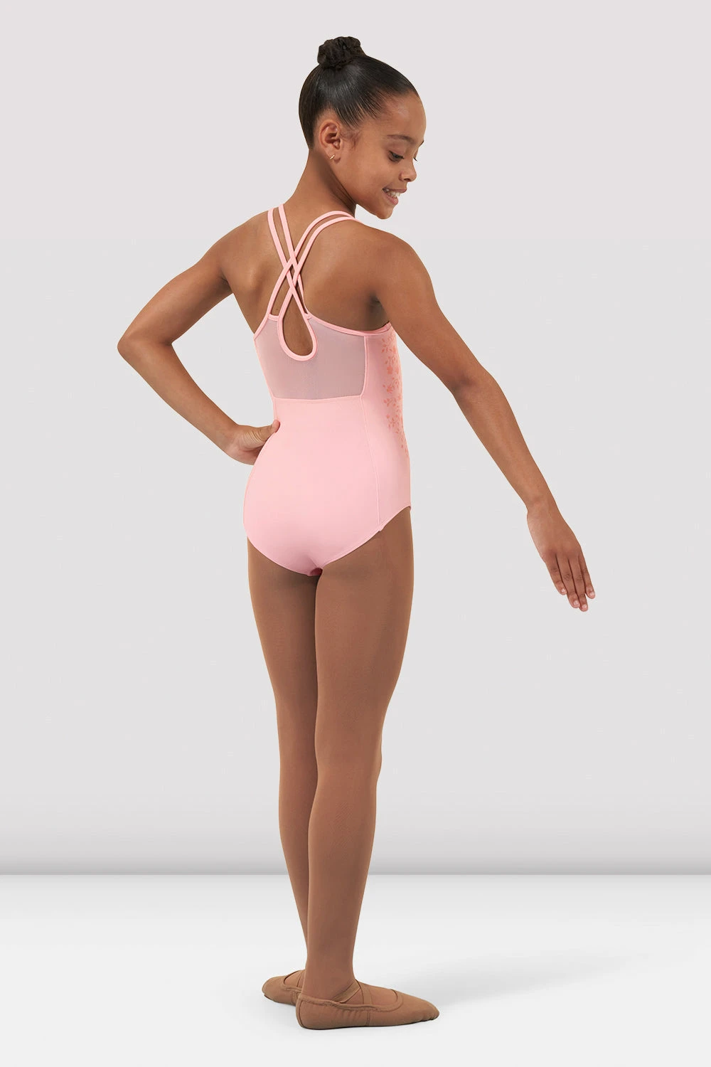 Our Girls Felicia Scoop Neck Leotard features a camisole design with a cross back, open teardrop back and mesh panels, finished with a flower vine printed bodice. Part of our BLOCH Vine Collection featuring a delicate cascading print in tonal colorways which complement each unique design.